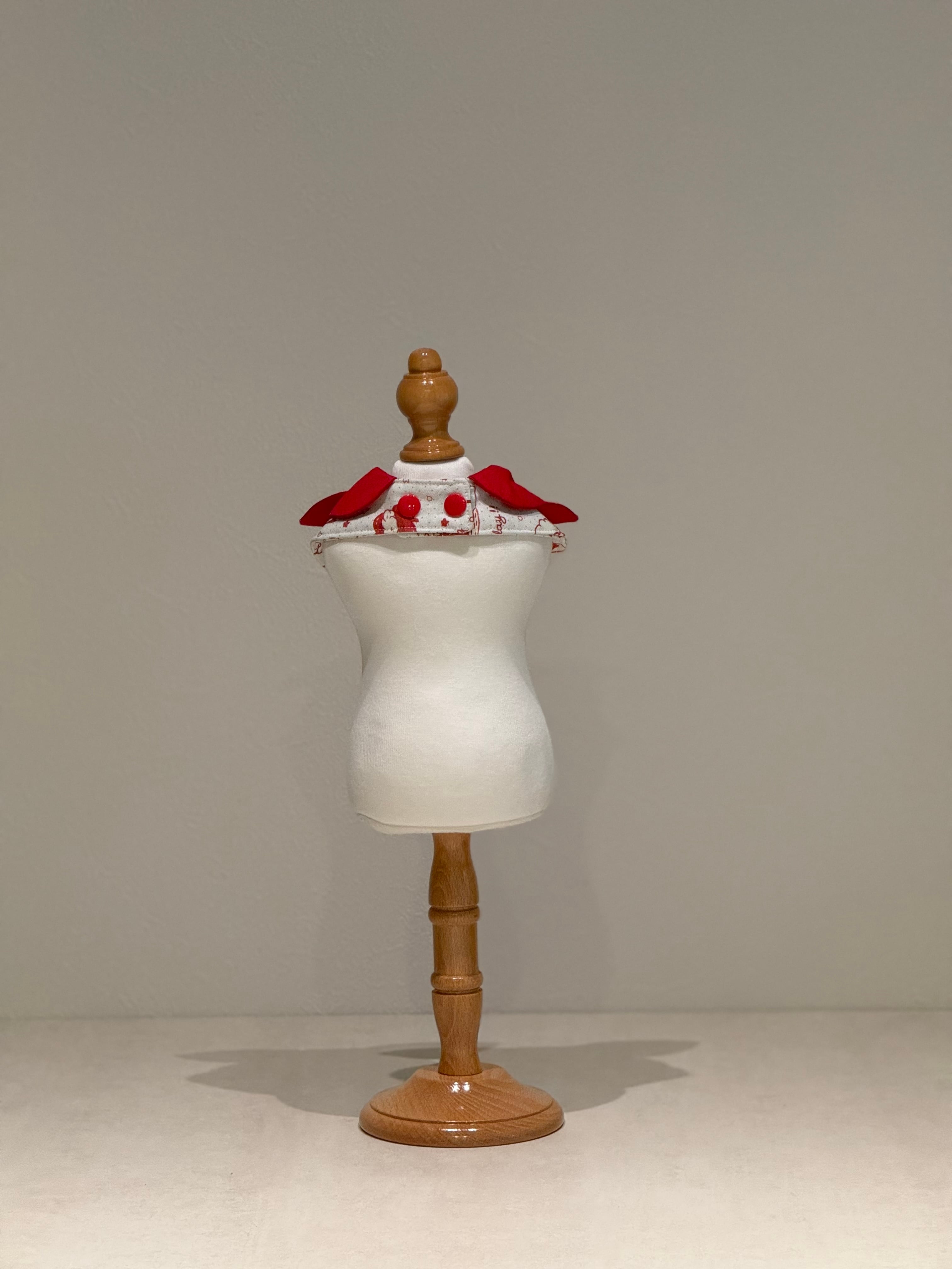 赤いリボンがアクセントのスタイです。リボンだけど男の子にも似合って、カジュアルに気軽に使えるデザイン。綿100%でしっかりした生地なので、形が崩れにくいのもうれしいポイントです。後ろの赤いボタンもかわいらしく、少しだけサイズ調整もできます。