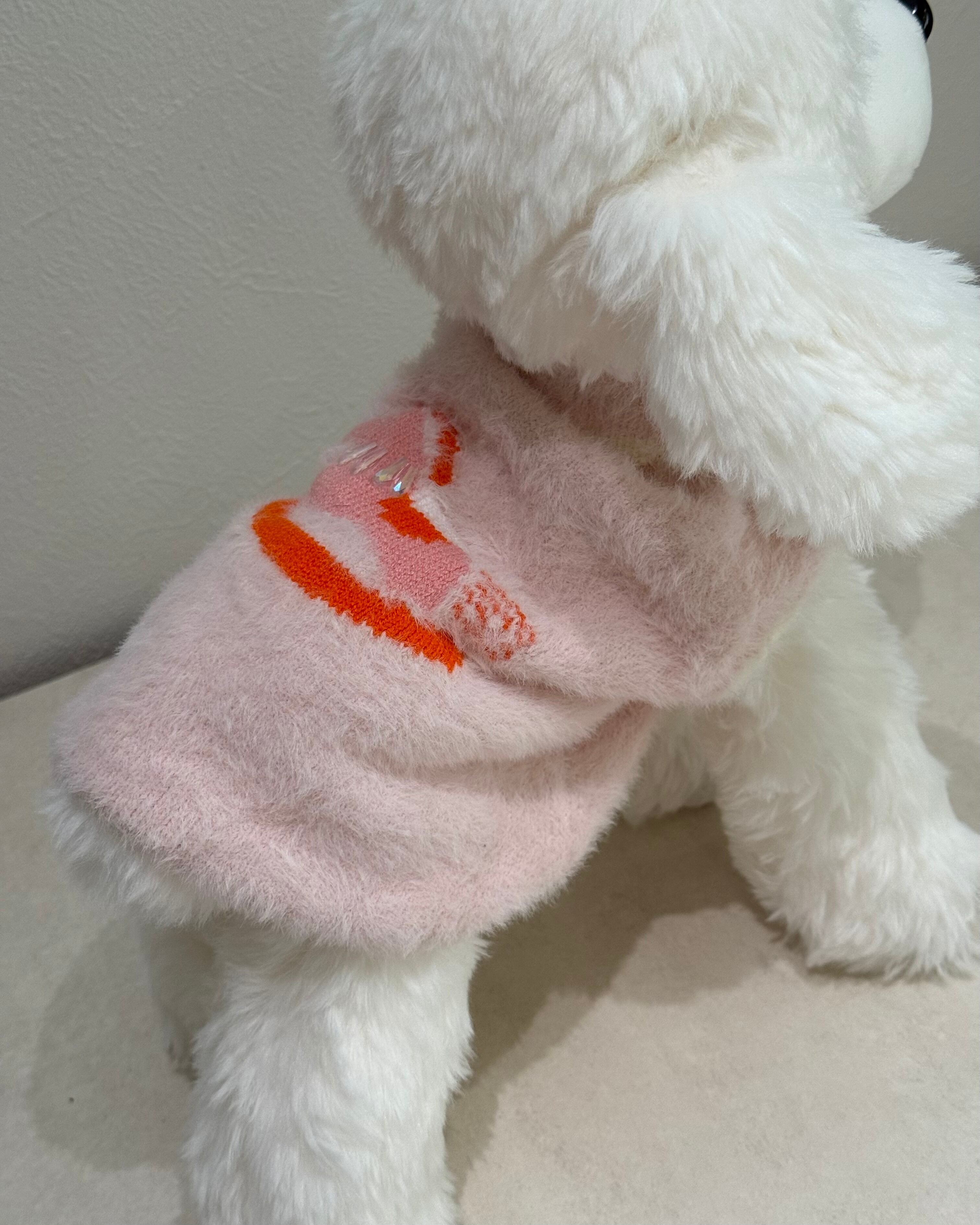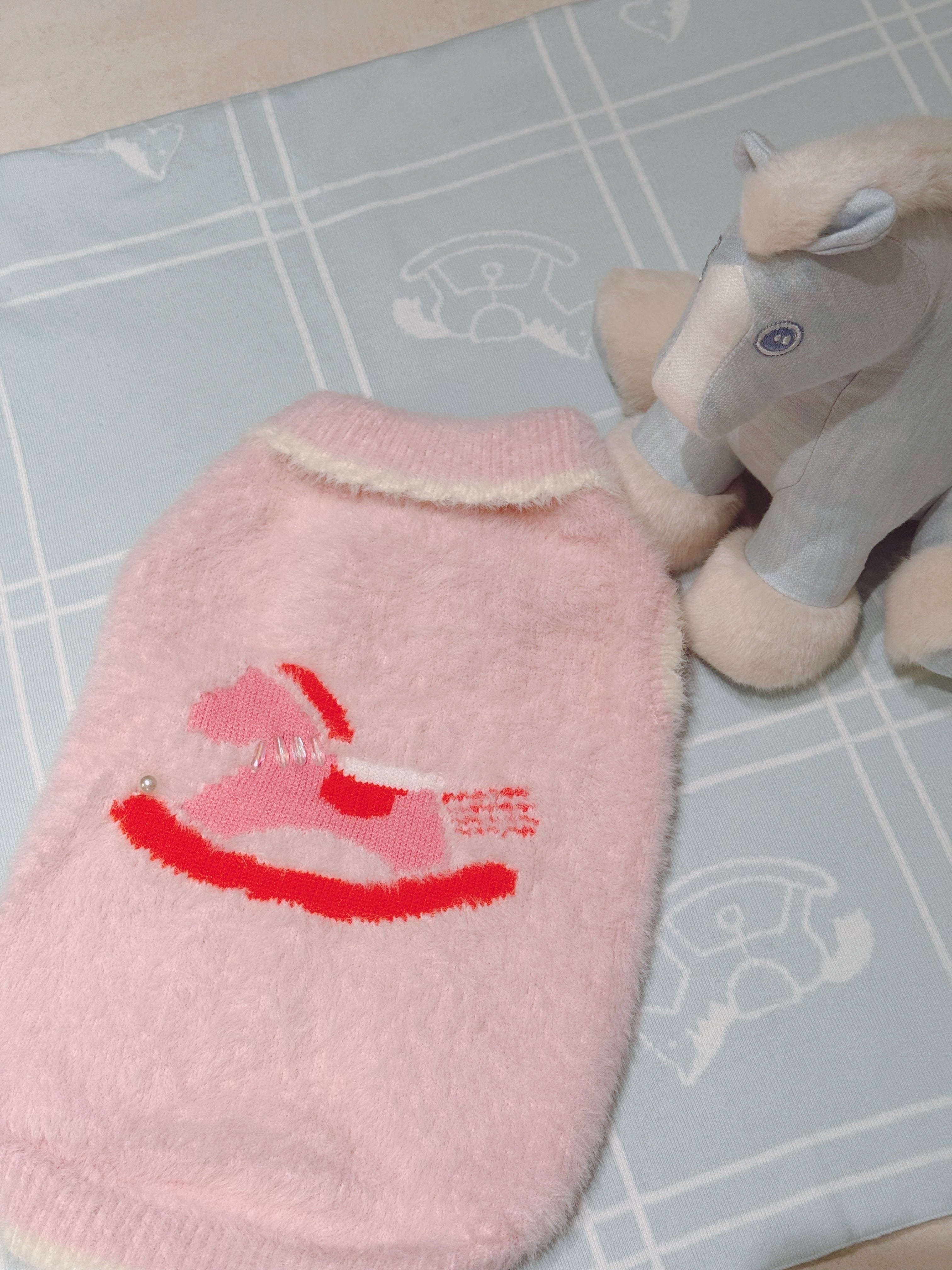 Dog/Cat ピンクふわふわニット 木馬&リボン